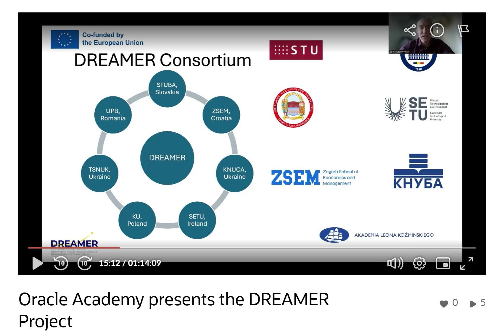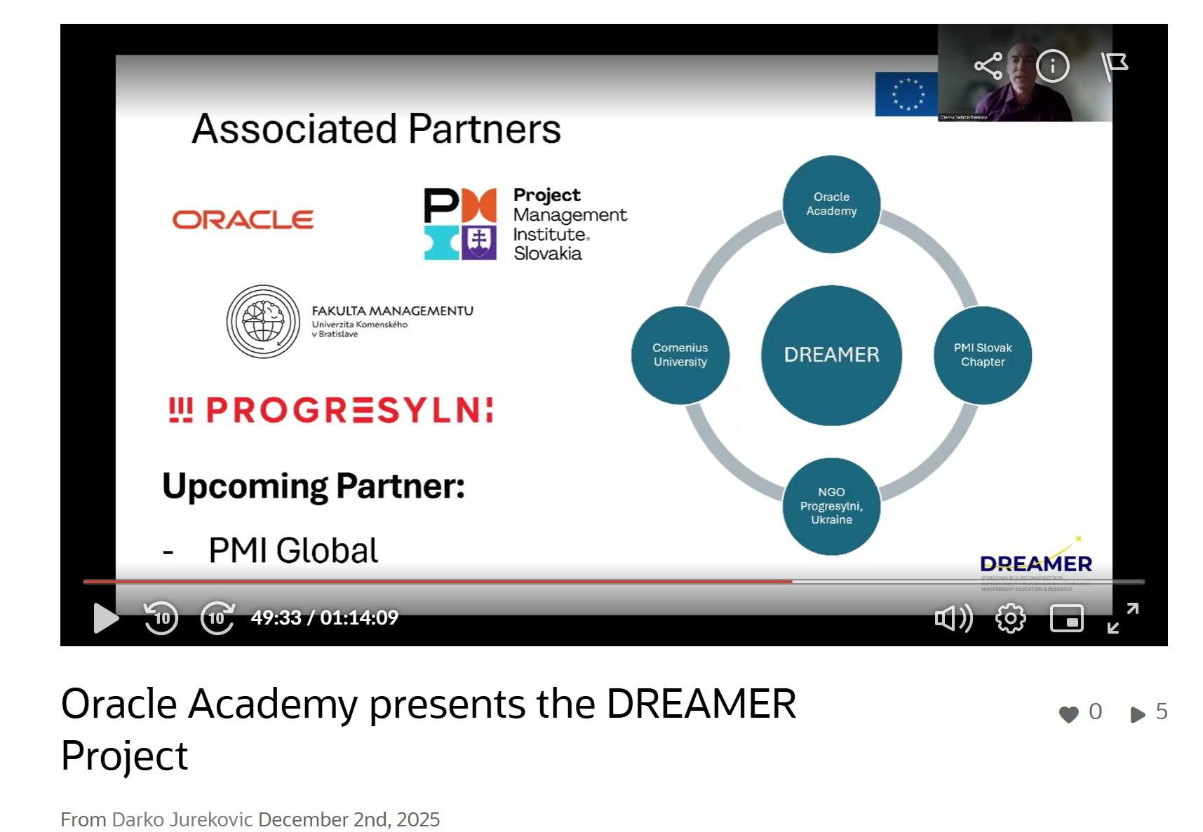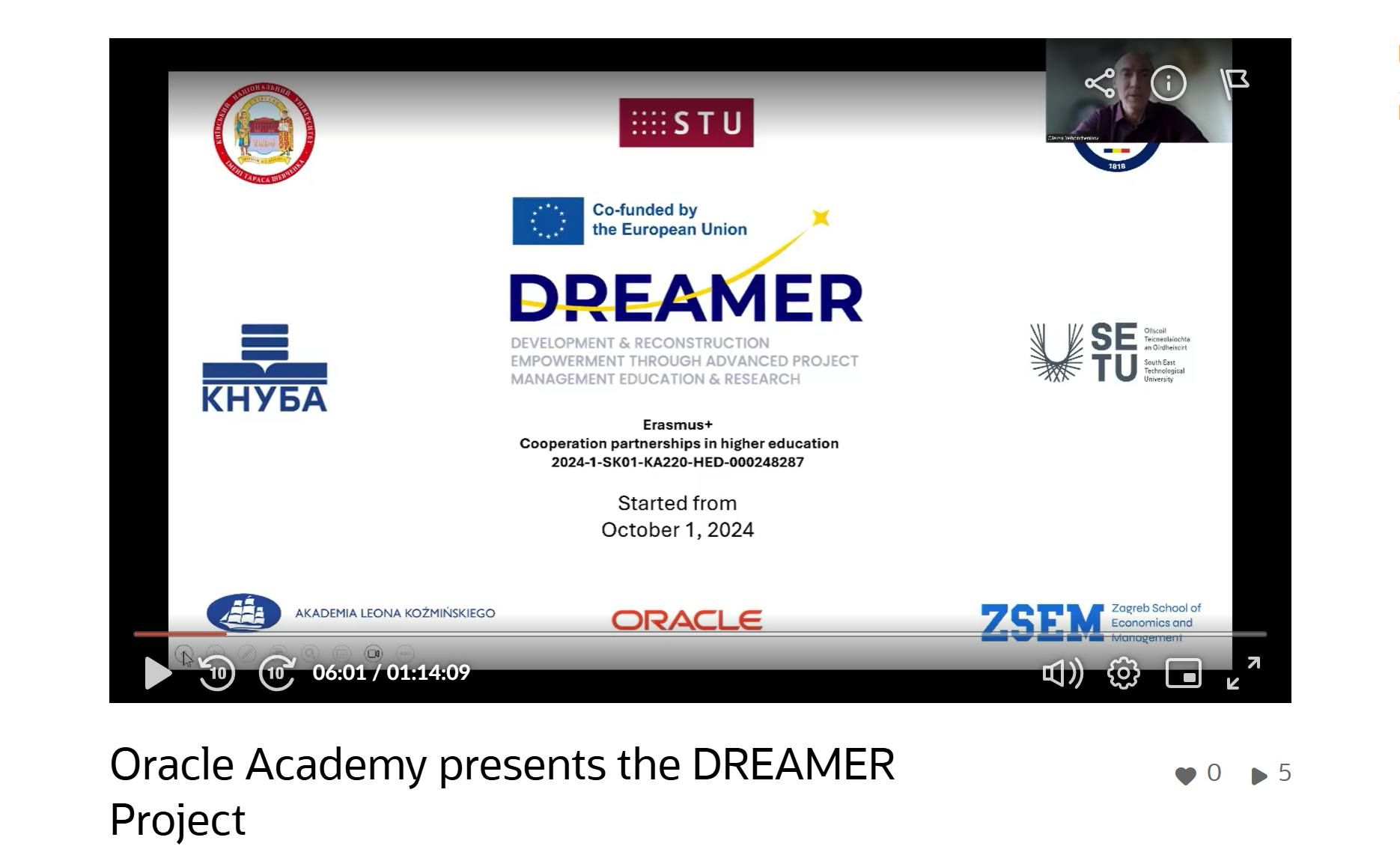 On 27 November 2025, we had the pleasure to present the Erasmus+ DREAMER project (Development and Reconstruction Empowerment through Advanced Project Management Education and Research) during the webinar “Oracle Academy presents the DREAMER Project” on the Oracle Academy portal. During the webinar, we presented how DREAMER: